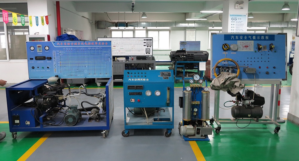主要设备名称及台套数:安全气囊实习测试台架2台、汽车电路电器工作原理10台、汽车自动空调系统电控故障实验台2台、冷媒回收加注机1台、空调系统部件4台套等实训教学设备。实训教学设备共计19台套。