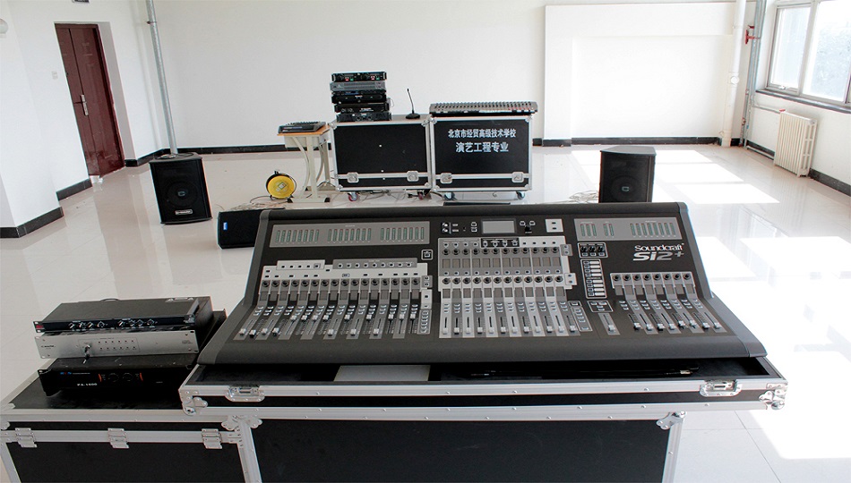北京市经贸高级技术学校音响师实训中心由8个实训场地构成,共有面积1376.4平方米,设备资金1044.6万元,215个工位。中心包括音频设备操作室、演艺音视频实训室、报告厅、演播厅、2个录音室、体育场、礼堂8处实训场地。