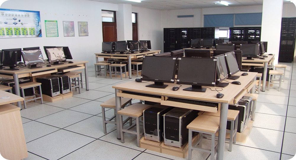 本实训室建筑面积96平方米,其中服务器1台、教师机1台、学生机40台、100M局域网连接,通过校园网可联入互联网。