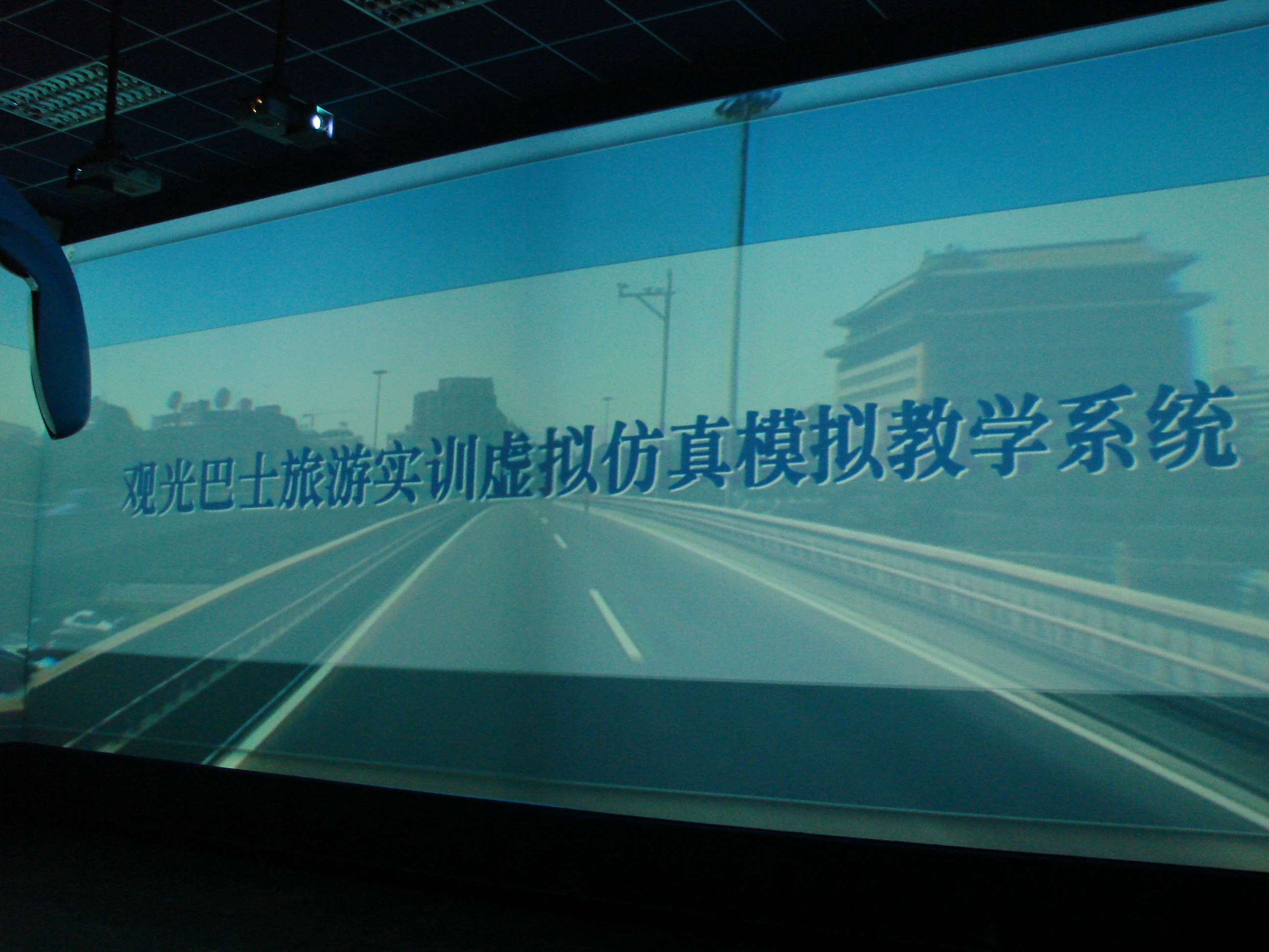 北京商贸职业技术校公共实训基地观光巴士实训间的旅游实训虚拟仿真教学系统包含有中央控制机、多通道数值媒体播放机、投影仪、功率放大器、音箱、屏幕、巴士、液晶显示器、数据交换设备、切换器、中央控制系统、实拍影片等,适用于导游员四级、三级的实训与考核。