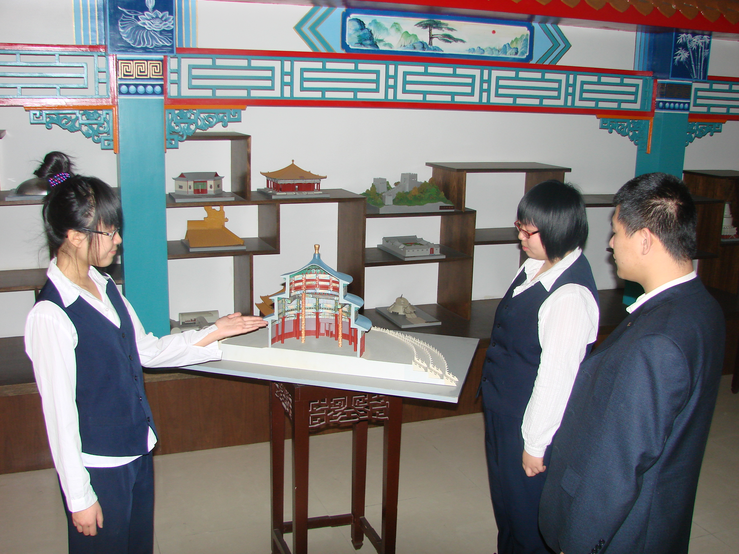 北京商贸职业技术校公共实训基地景点沙盘实训间有依教学用途设计(太和殿、祈年殿、四合院、长陵、定陵地宫等)的独体模型20套;景泰蓝、花丝镶嵌、玉雕、鼻烟壶、绢花、料器、面人、风筝、玻璃葡萄单体模型共24套,适用于导游员四级、三级的实训与考核。