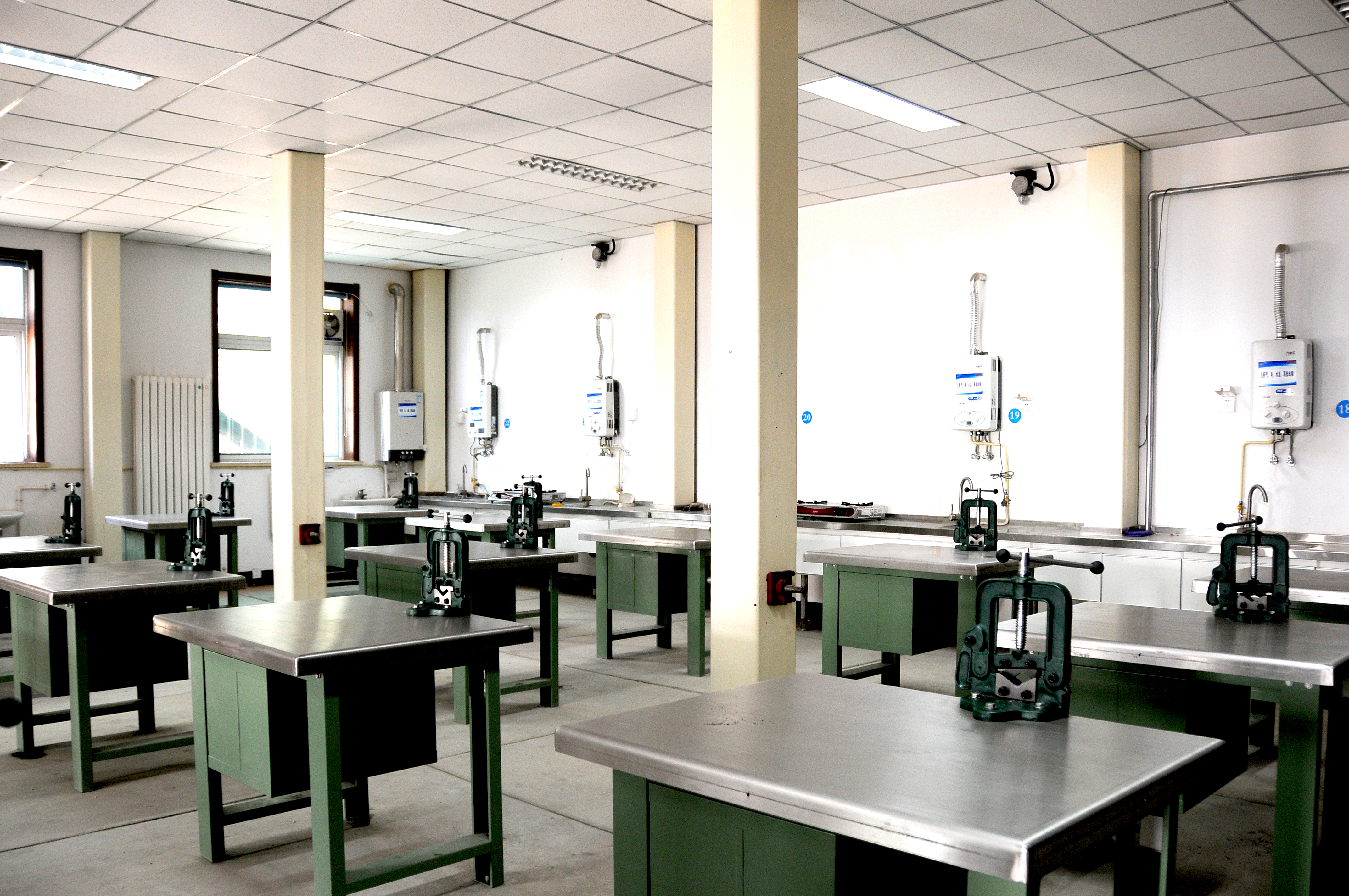 燃气具综合实训室总面积约为202平方米,1个实训间共有26个独立操作工位,可用于燃气具安装维修工从初级到级技师全部等级管件制作和安装职业技能培训。