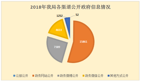 通过不同渠道和方式公开政府信息的情况,包括政府公报公开政府信息数52条;政府网站公开政府信息数15861条;政务微博公开政府信息数7389条;政务微信公开政府信息数4653条;其他方式公开政府信息数1252条。