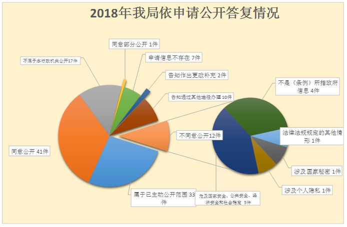 2018年我局123件申请事项全部按期答复。已答复的123项申请中:申请内容明确,可以答复是否公开的共86项(占总数的70%);其它答复类型共37项(占总数的30%)。其中:
