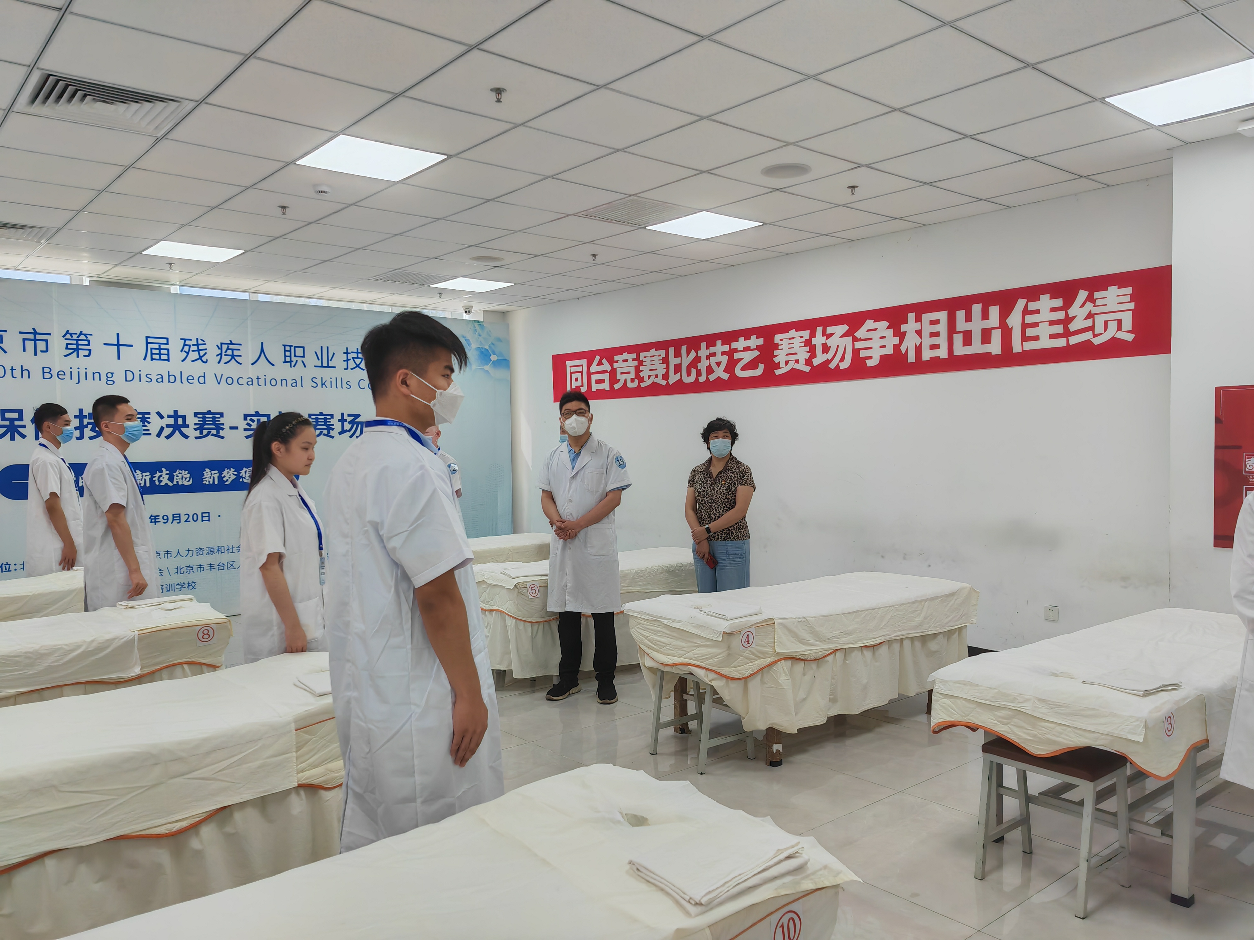 9月20日,由丰台区残疾人联合会、丰台区人力资源社会保障局承办的北京市第十届残疾人职业技能竞赛盲人保健按摩决赛圆满结束,23名视力残疾人选手参加决赛,同场竞技。北京市残联社会保障和就业服务中心二级调研员朱丽莉、副主任安玉峰,丰台区残联副理事长李然,丰台区人力资源和社会保障局副局长尹素云现场指导工作。