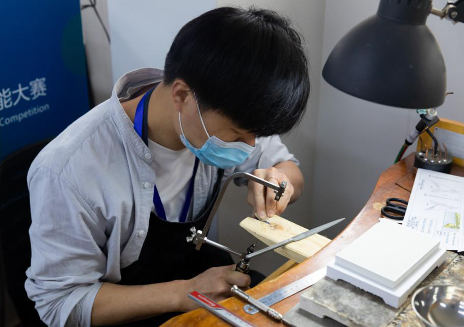 据了解,本次比赛分为理论、实操部分,共有2个赛程、3个模块,共举办3天。比赛首日,经过1个半小时的理论测试后,选手们来到实操比赛场地,进入到珠宝加工现场制作竞赛环节,该环节由3个模块组成,制作出的作品将由裁判组进行综合评分。选手们拿到设计图纸后,将各种片状、条状的贵金属材料,经过锉削、镂空、锯切、焊接、抛光等技术方法进行精细处理,力争制作出与图纸尺寸、大小、形状一致、层次优美的珠宝首饰。